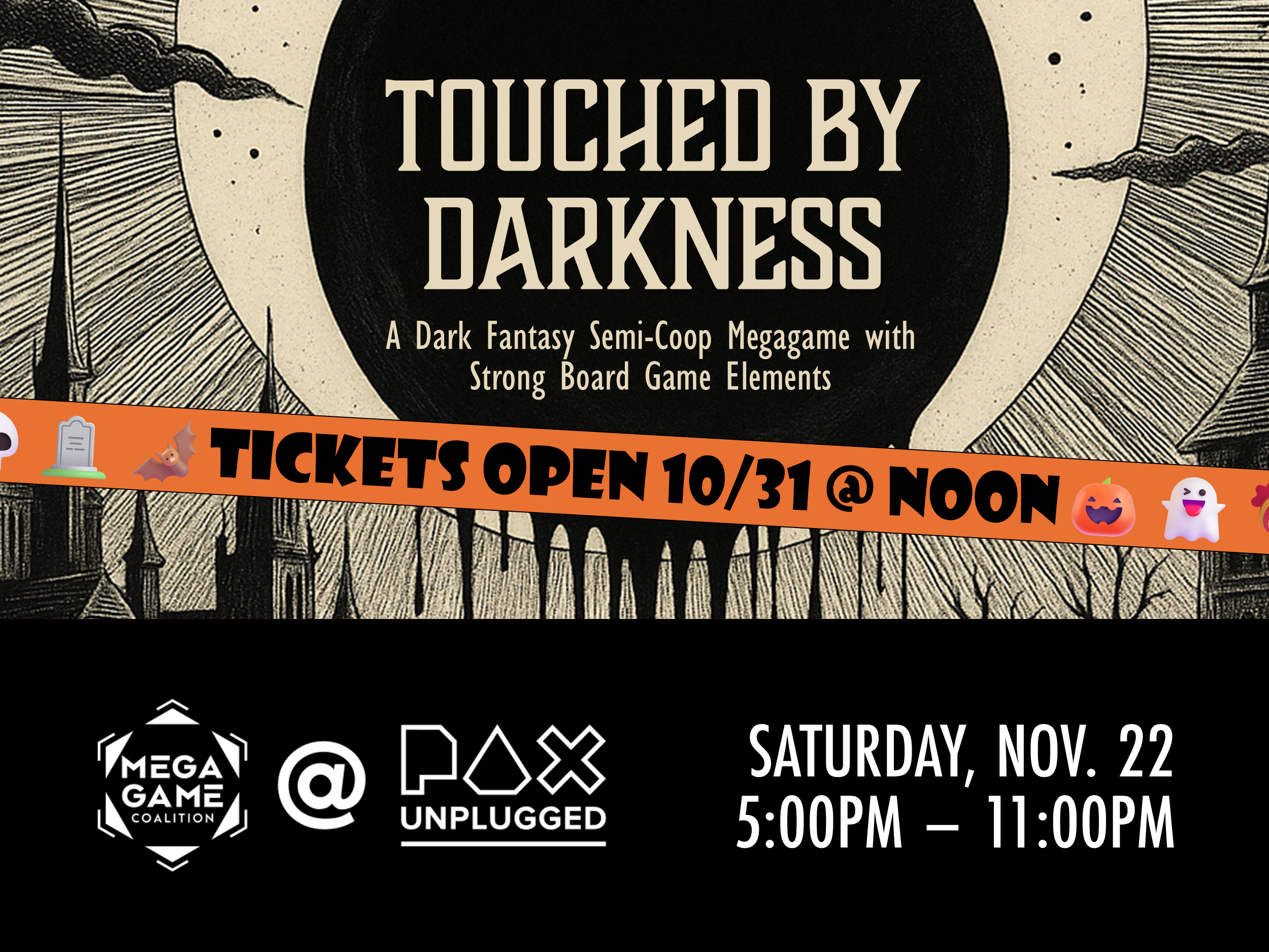 The Megagame Coalition is proud to present Touched by Darkness - a semi-cooperative dark fantasy megagame by games designer Ben Kanelos (BK Game Design) for PAX Unplugged 2025!